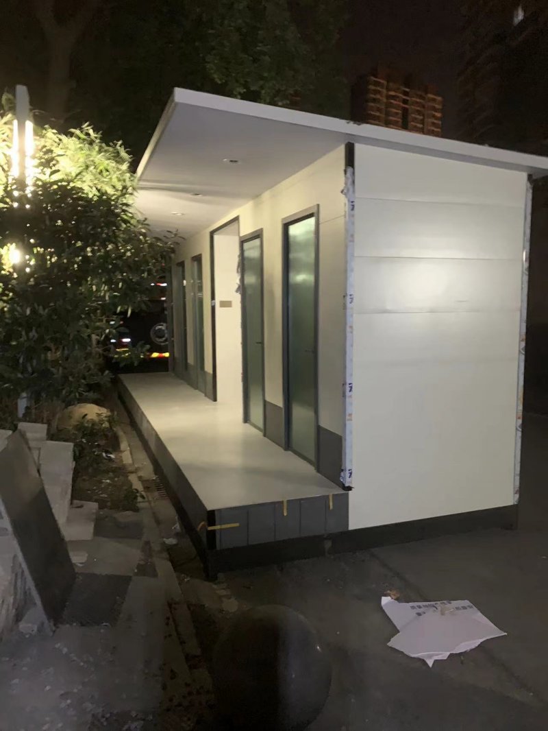 拼裝廁所;在廠里做好各個廁所部件,再到現場組裝在一齊,適合不易運輸的大型廁所。這座箱式廁所,女廁5個蹲位內配工具間,男廁2個蹲位+2小便斗,第三衛生間由殘疾馬桶、助力洗手盆和兒童馬桶、兒童洗手盆外加嬰兒臺等設施。廁所前后有窗,通風采光,前部走廊裝有屋檐,防雨防曬。此廁所位于公路綠道邊,整體大氣,功能齊全,造型美觀,是一道難得的靚麗景觀!